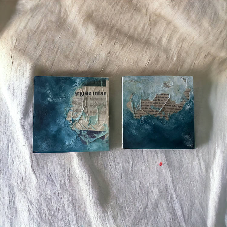 این اثر خاص با ترکیب بافت مواج اقیانوس و المانهای روزنامهای، جلوهای متفاوت و مدرن خلق کرده است. تضاد میان حرکت سیال آب و ساختار منظم متن، عمق و پویایی خاصی به تابلو میبخشد.