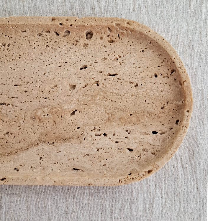 این ظرف لوکس از سنگ طبیعی تراورتن ساخته شده و با بافت و رگههای خاص و طبیعی خود، جلوهای منحصربهفرد به فضا میبخشد. طراحی مینیمال و دستساز این اکسسوری باعث میشود هم در دکور منزل و فروشگاه، و هم برای استفادههای روزمره مانند چیدمان شیرینی، شکلات یا وسایل روتین پوستی جلوهای چشمنواز داشته باشد.