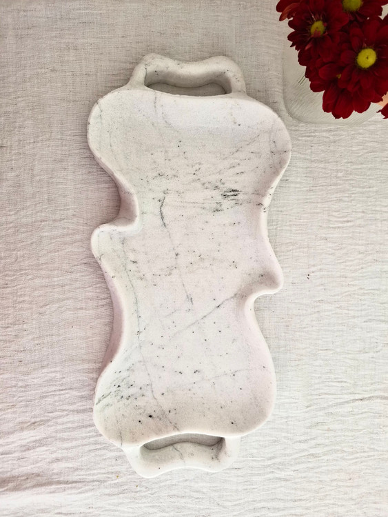 این ظرف دِفرمه از سنگ طبیعی تراورتن ساخته شده و طراحی نامتقارن و خاص آن، حس هنر و اصالت را در نگاه اول منتقل میکند. وجود دسته سنگی با فرم طبیعی و ارگانیک، جلوهای مدرن و در عین حال مینیمال به این اثر دستساز میدهد.